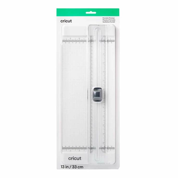 It’s a cinch to cut straight lines when you use the 13 in (33 cm) Portable Trimmer. A unique easy-glide blade system yields precise, straight cuts, while an ergonomic, custom-fit handle provides a smooth grip over hundreds of cuts. The dual-hinged rail makes it simple to quickly load materials, measure, and cut from either side. Continuous measuring marks, rulers in inches and centimeters, and 1/4 in (0.3 cm) grid marks – along with a 16 in (40 cm) swing-out arm – help you measure for accurate results. Keep replacement blades in the convenient storage compartments on the underside of the trimmer.